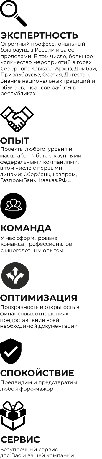 Огромный профессиональный бэкграунд в России и за ее пределами. В том числе, большое количество мероприятий в горах Северного Кавказа: Архыз, Домбай, Приэльбрусье, Осетия, Дагестан. Знание национальных традиций и обычаев, нюансов работы в республиках.